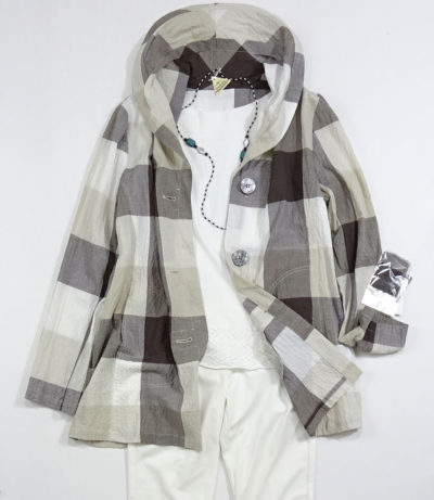 薄手のコットンジャケットは茶系のブロックチェック柄